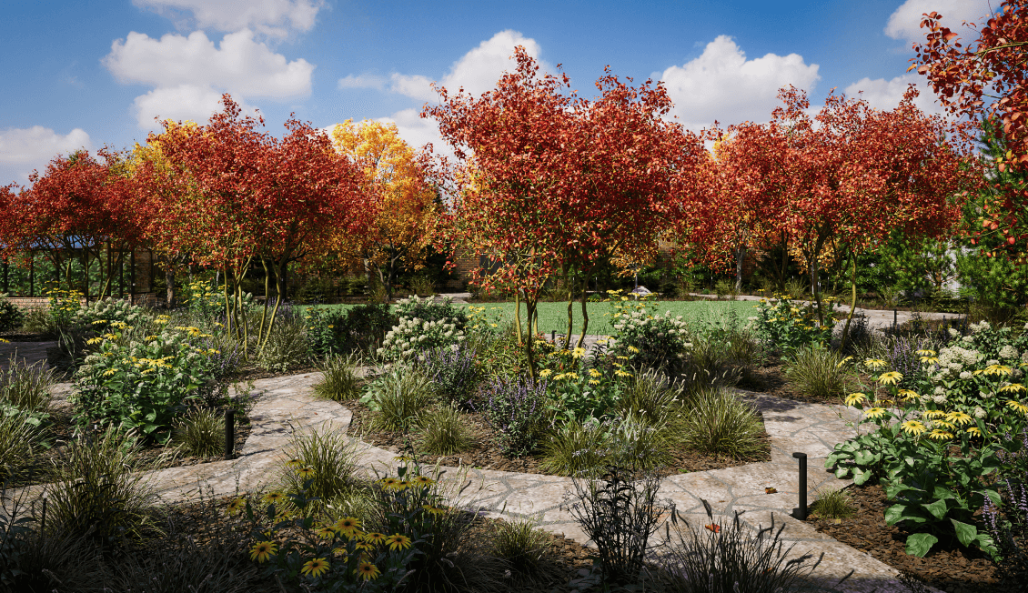 Многолетники в цветнике подобраны так, что он будет сохранять свою декоративность с поздней весны до ранней осени. Для придания необходимого объема центральной зоны в цветник был добавлен верхний ярус. Мы довольно часто используем иргу Ламарка в наших работах, и в этом проекте она нам пригодилась тоже. Этот высокий многоствольный кустарник задаёт легкую структурность и прекрасно выглядит в любое время года.