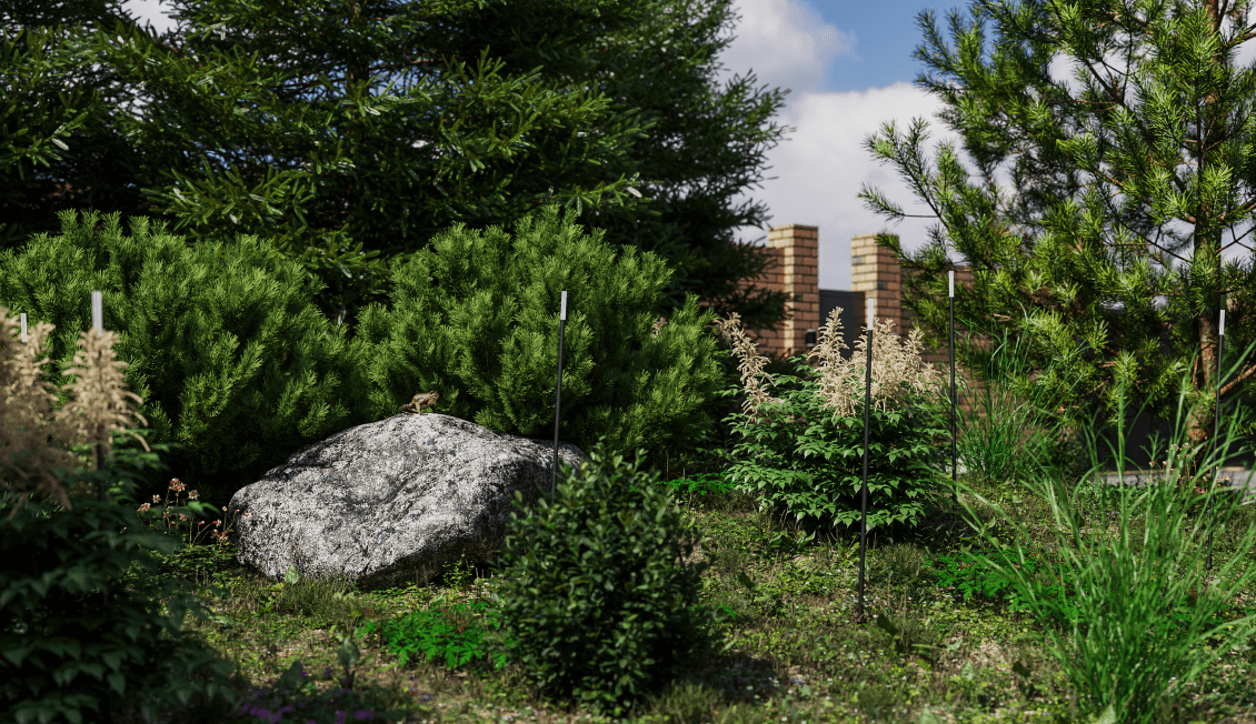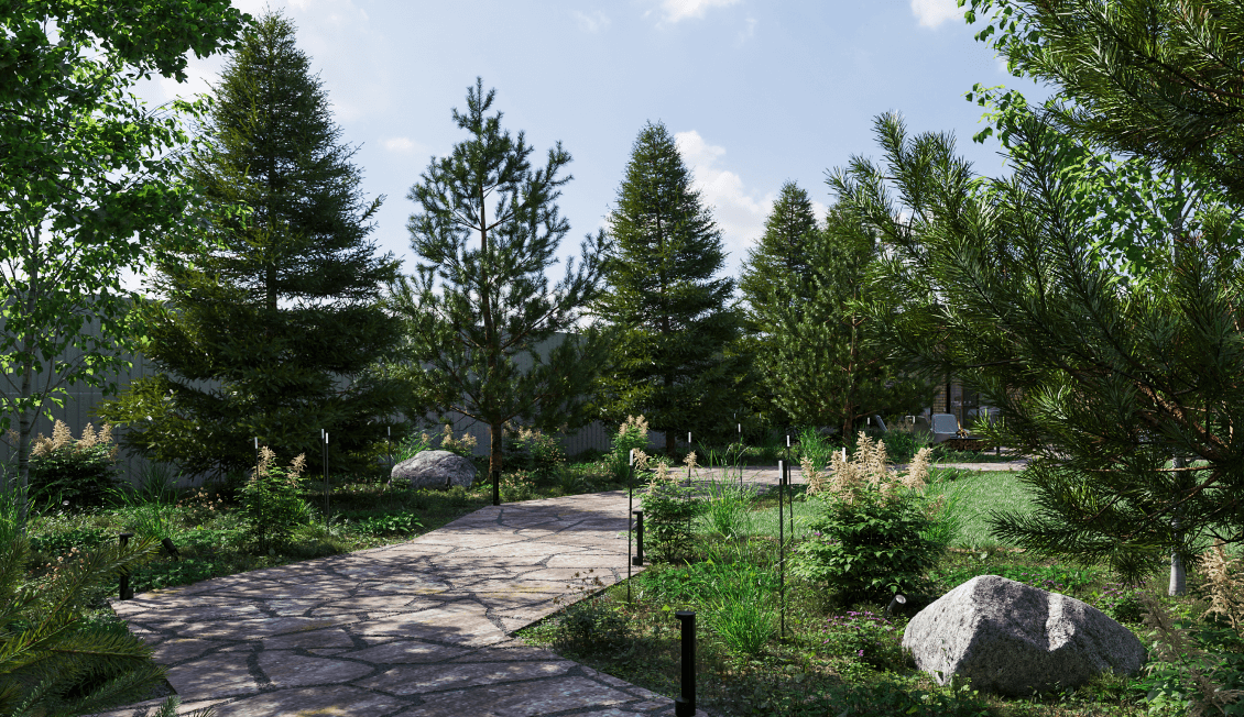 Вокруг центральной воссоздана лесная среда, состоящая из хвойных и лиственных деревьев, кустарников и подлеска из лесных растений. Этот естественный фон обволакивает участок и у зрителя внутри создается ощущение, что он находится в лесу, а не в коттеджном посёлке, где вокруг соседи. Он почти не видит забор за крупными хвойными деревьями. Эта зона получилась довольно большой. Заблудиться здесь, конечно, не получится, но небольшое путешествие по лесу совершить получится.