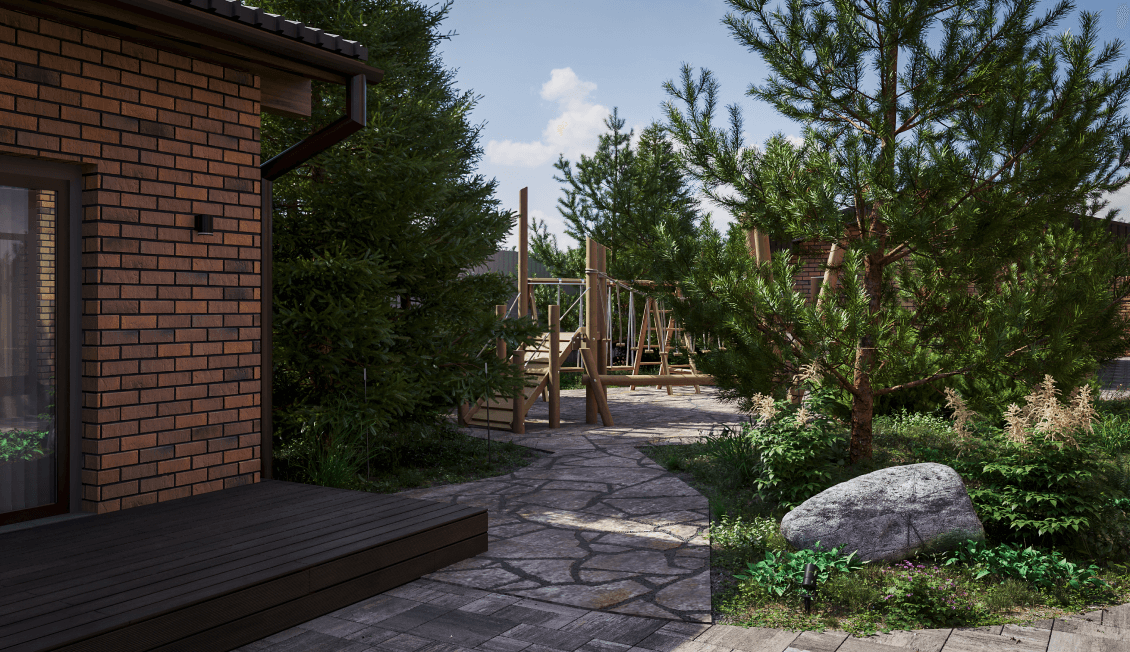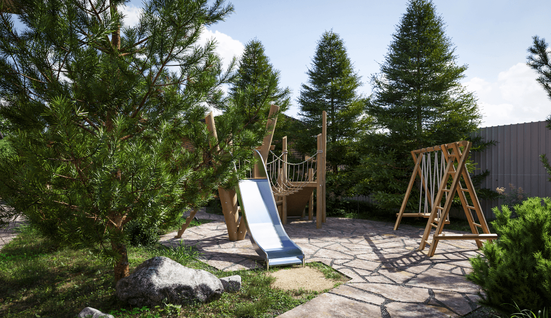 Для детей мы предусмотрели детскую игровую зону в глубине лесной части. Большой газон также может быть использован для активных игр. Да и лесная часть участка — это одна сплошная игровая зона для детей: здесь можно играть в прятки, собирать землянику, изучать растения и насекомых.