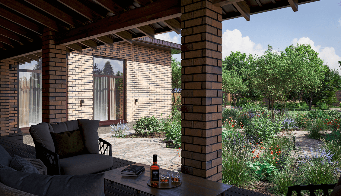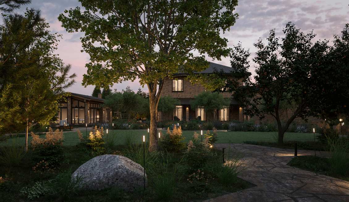 На участке расположен большой дом с тёплым гаражом и крытой террасой, гостевой гараж и летняя кухня. Хозяин участка хотел себе место, где он мог бы собрать всю свою семью, где можно было бы весело проводить время с детьми, собираться с друзьями, отдыхать душой и сердцем. При этом важной ценностью для него являлась малоуходность сада. Все эти особенности учитывались нами при проектировании.