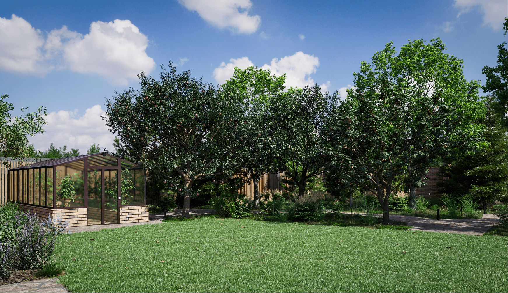 Ещё заказчик хотел теплицу для выращивания своих овощей и зелени. Для теплицы тоже нашлось солнечное место. Рядом с ней мы расположили плодовый сад.