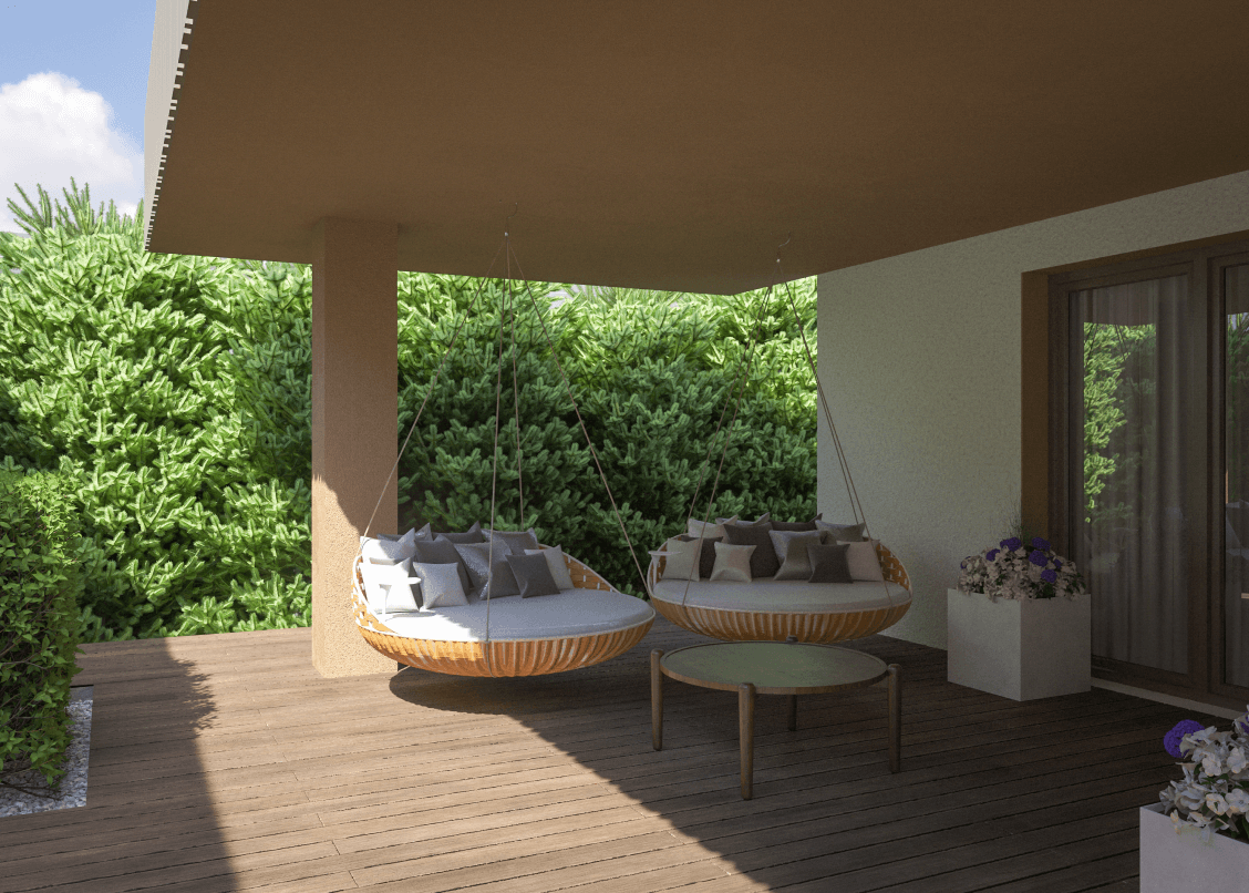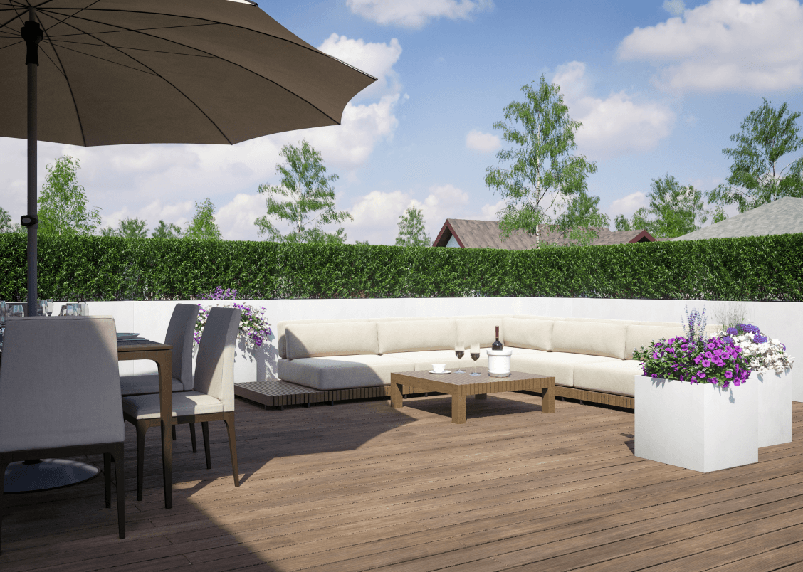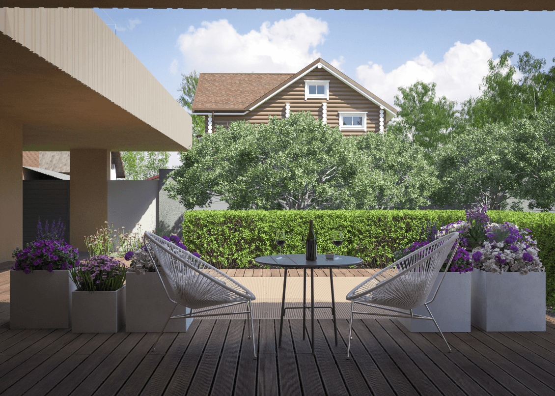 Террасу было решено оживить, добавив внутрь вставки из стриженых кубов кизильника блестящего и гортензии метельчатой там, где это было удобно. Под навесом террасы была расположена зона с переносным барбекю, обеденная зона с большим столом и диванами, два подвесных кресла с кофейным столиком чуть поодаль для уединённого отдыха.