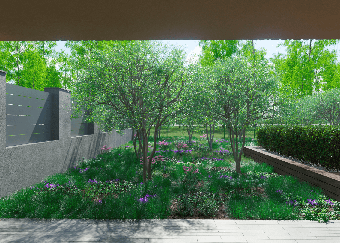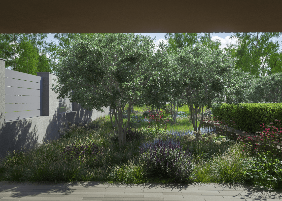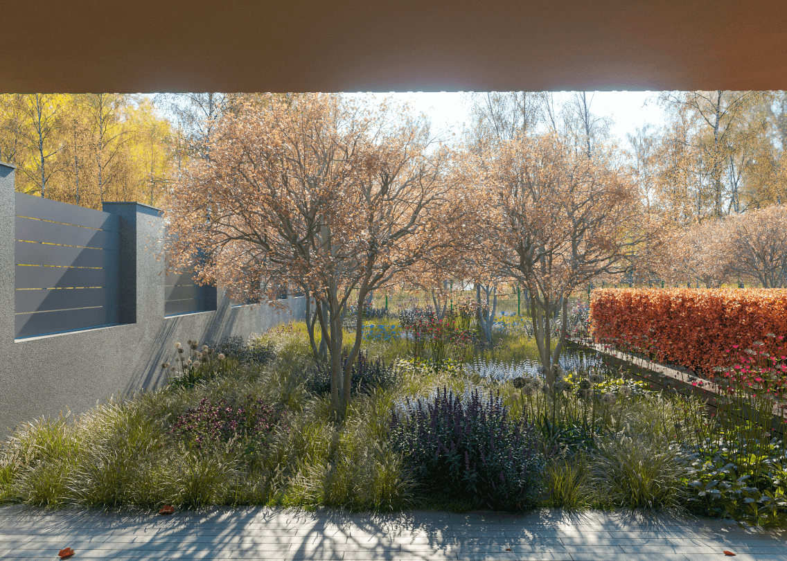 Одним из главных растительных элементов дизайна сада является цветник во входной зоне. Он спроектирован по своему составу так, что многолетники сменяют друг друга в цветении, а злаки дают необходимый объём весь сезон. Над цветником вздымаются кроны ирги Ламарка, которая ценится своим весенним цветением, запахом и осенними красками.