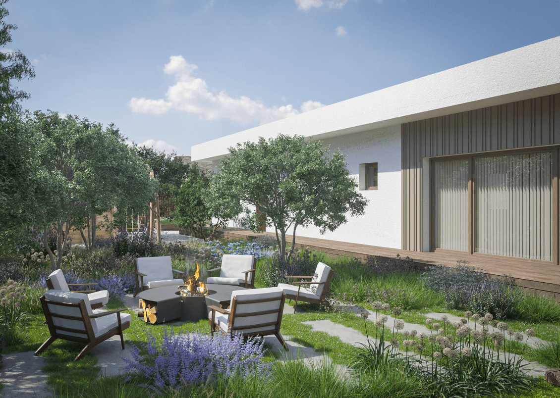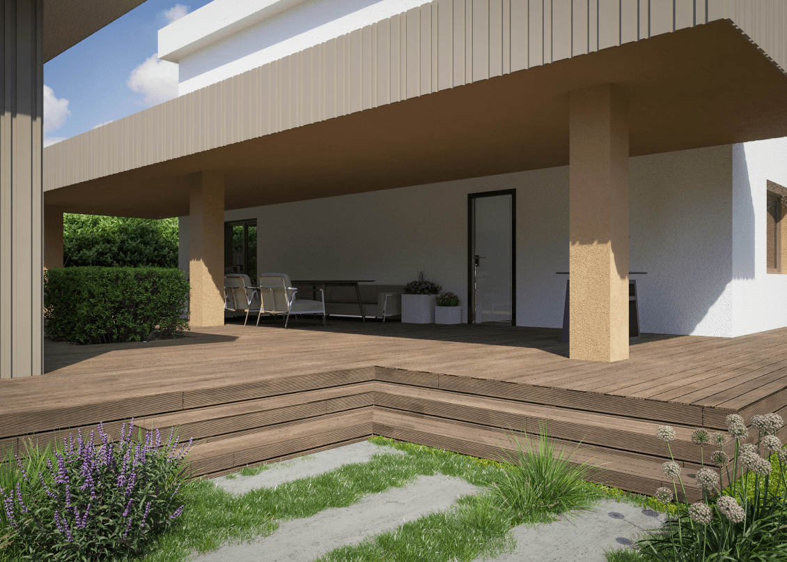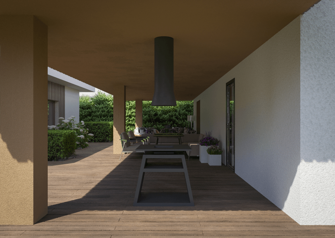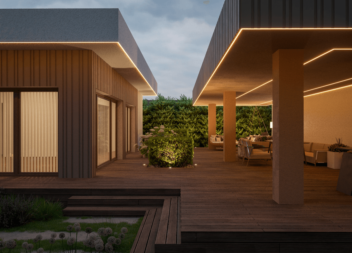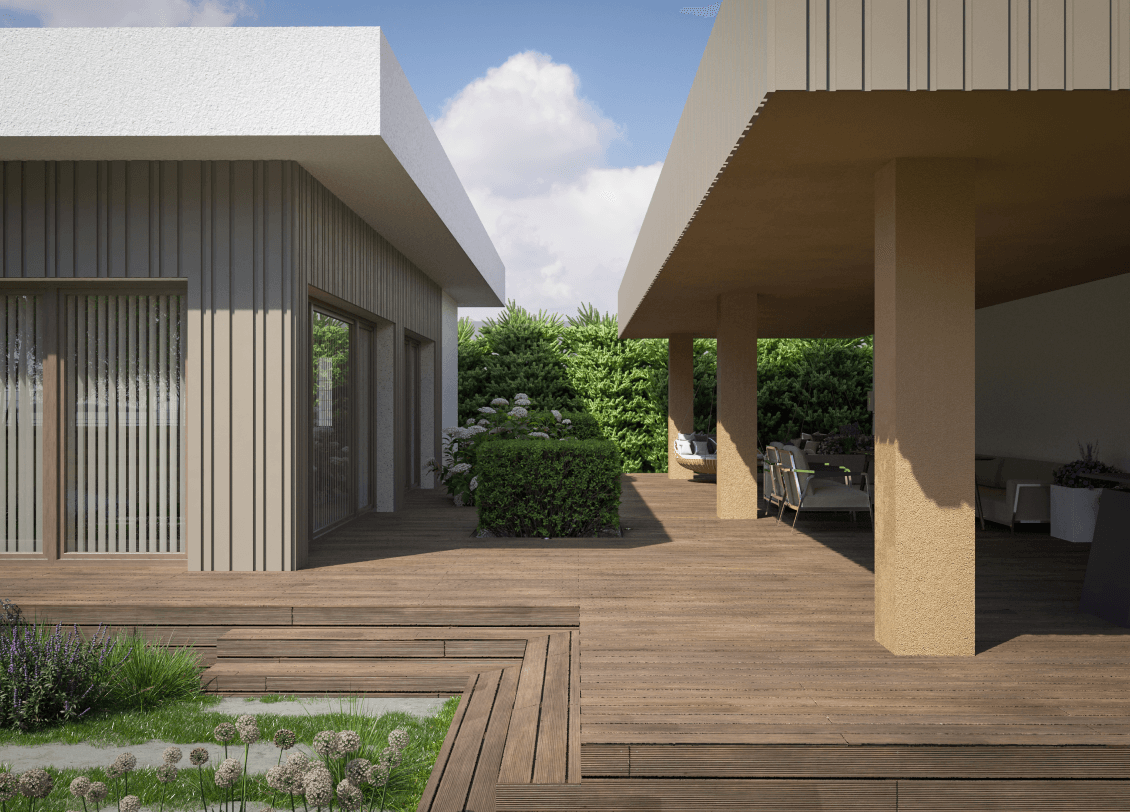 Все основные перемещения по участку будут происходить по террасе, обрамляющей здания, с зоной отдыха под навесом в центре.