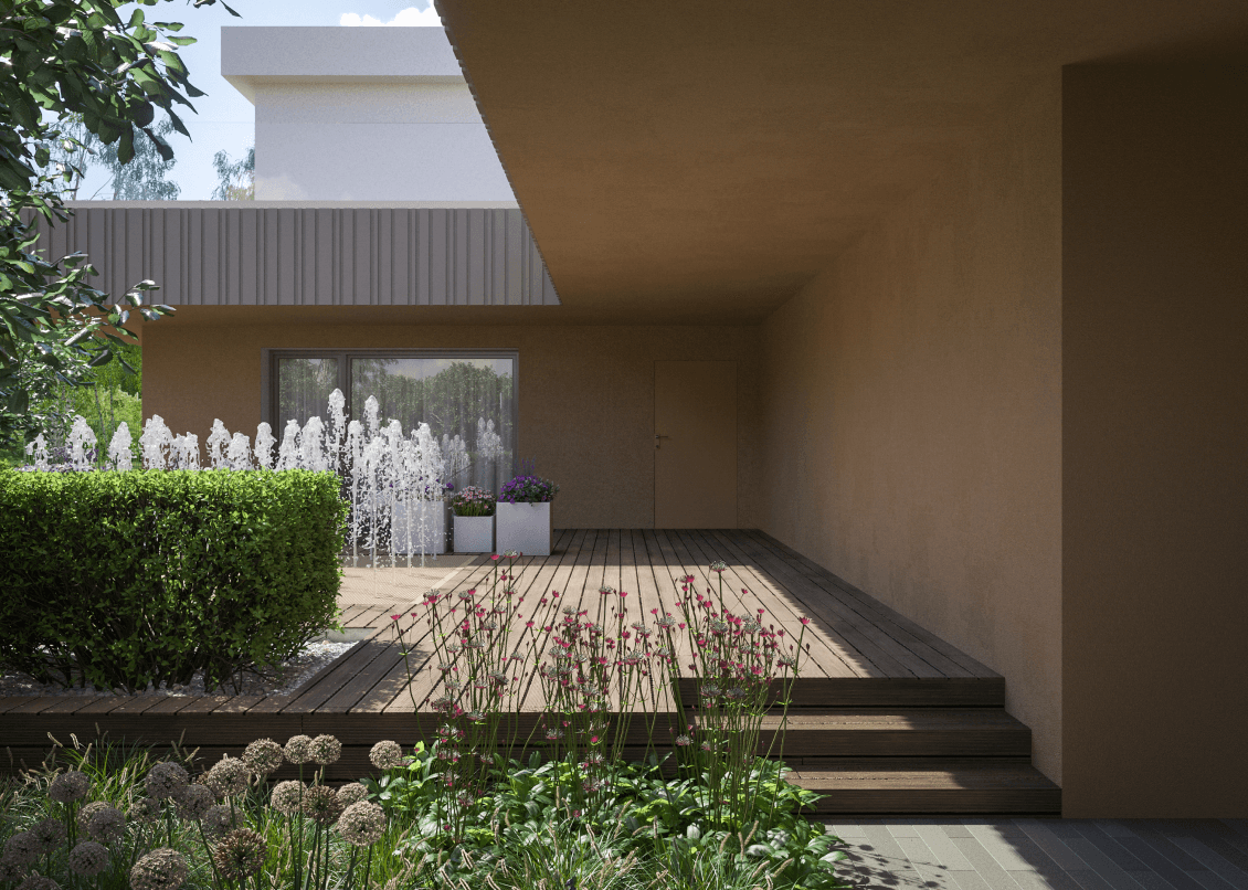 К началу нашей работы над проектом на участке уже была возведена коробка двухэтажного жилого дома с гаражом и эксплуатируемой кровлей над ним и одноэтажной бани с бассейном. Здания по проекту планировалось объединить общей террасой вокруг, уже был выполнен фундамент под эту террасу. Ещё заказчики хотели видеть у себя на участке фонтан, мангальную зону рядом с зоной отдыха, небольшую игровую зону для детей и огород с высокими грядками и теплицами.