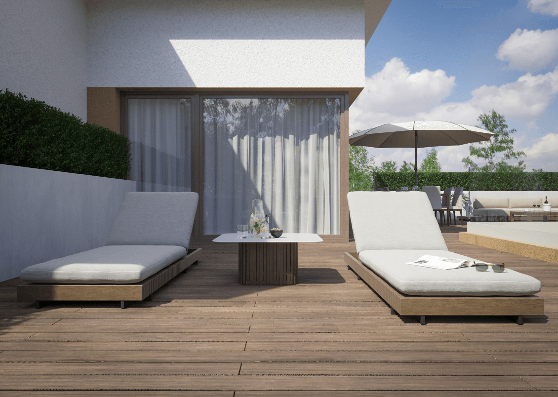На эксплуатируемой террасе было решено сделать две зоны. В первой зоне, обращённой к озеру и лесу, расположились лежаки для приёма солнечных ванн. Во второй зоне — большой угловой диван с журнальным столиком и небольшой обеденный стол с зонтом от солнца для вечернего чаепития. Терраса, также как и сухой фонтан уровнем ниже, обрамляется изгородью из кизильника блестящего, размещённого в отдельные контейнеры.