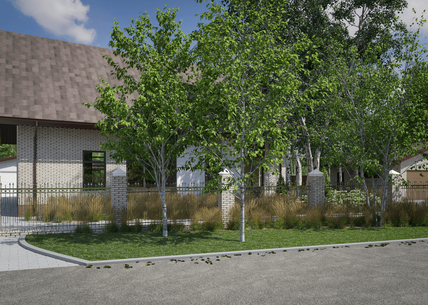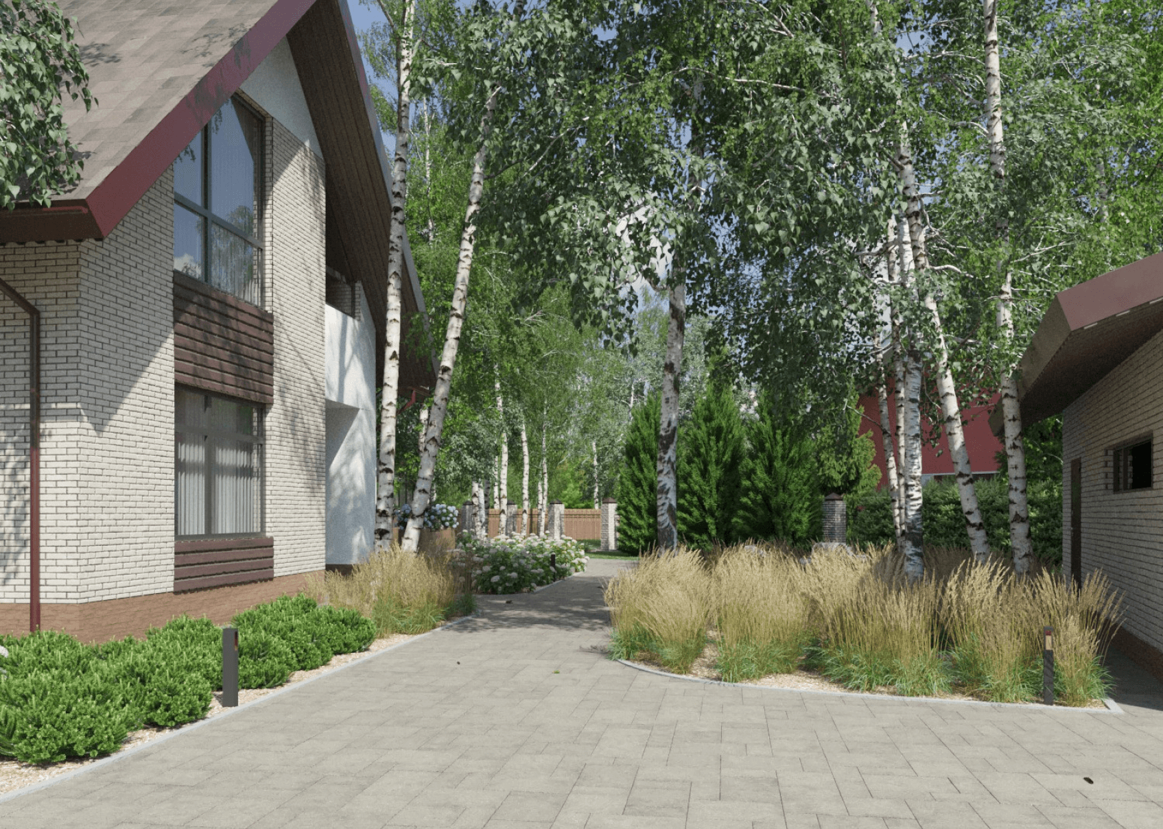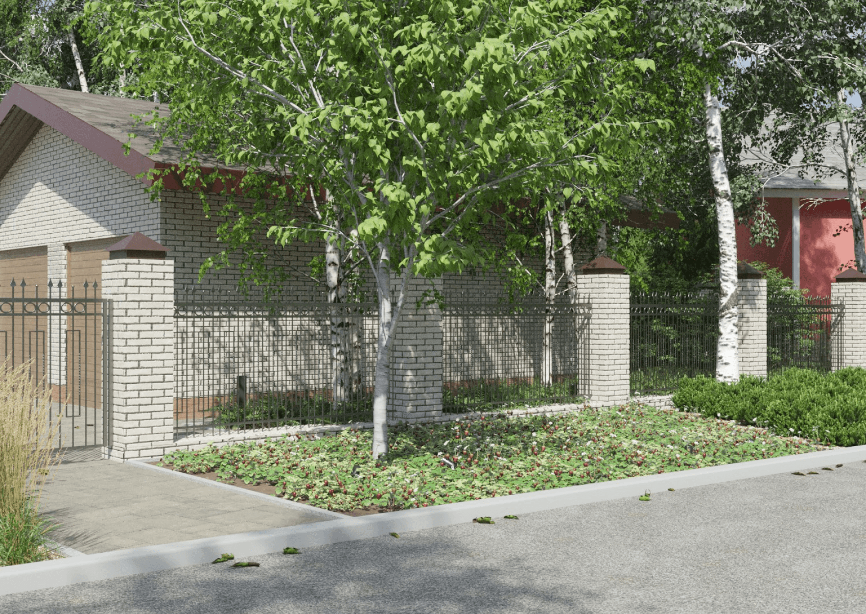 Были добавлены несколько берёз в местах, где нужен был объём. После завершения проектных работ, сад был реализован. Кустарники и злаки были высажены достаточно плотно, чтобы они полностью смыкались, образуя массив. А хорошо разросшийся покров из клубники, высаженный со стороны улицы, стал очень популярен у местных детей.