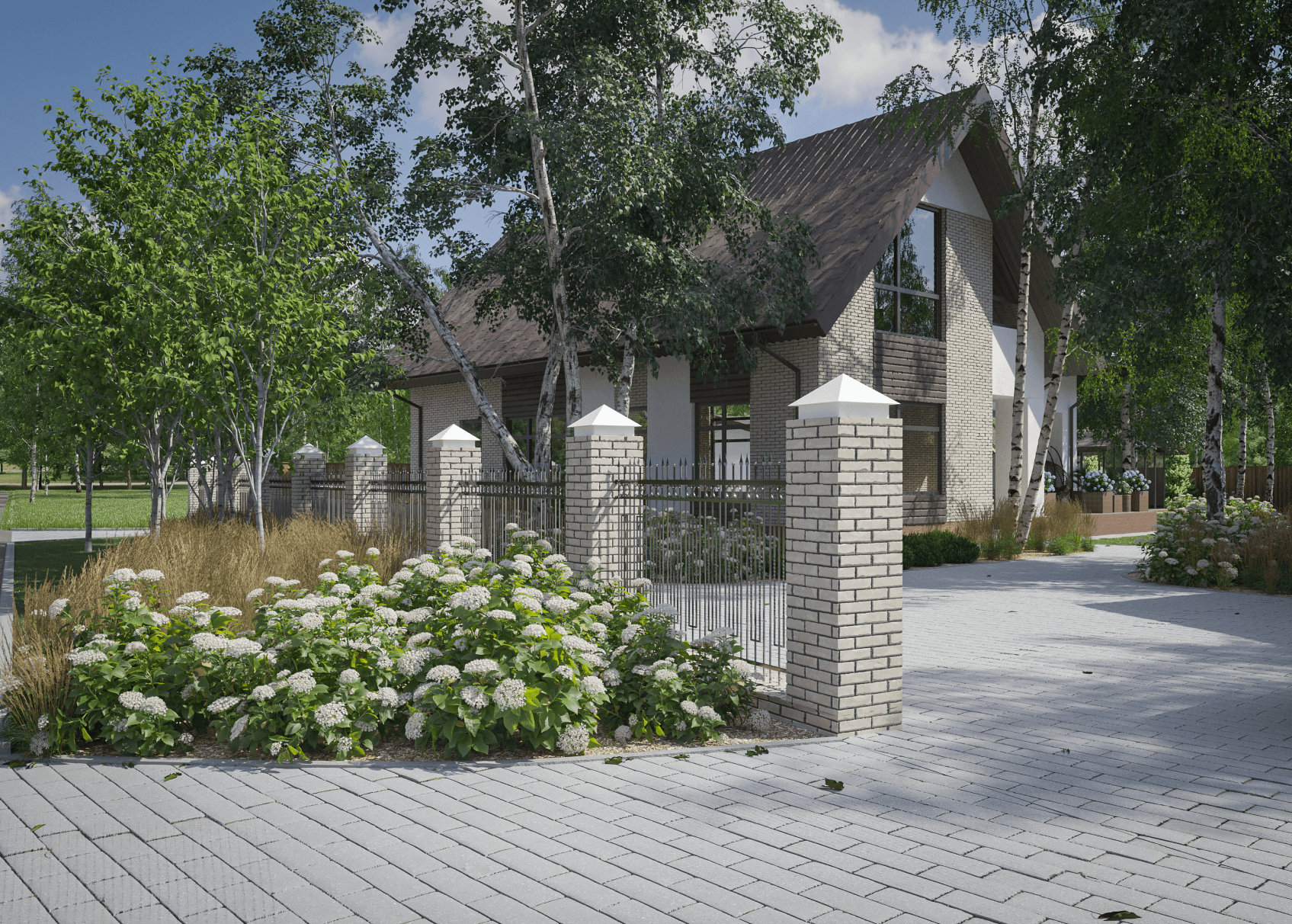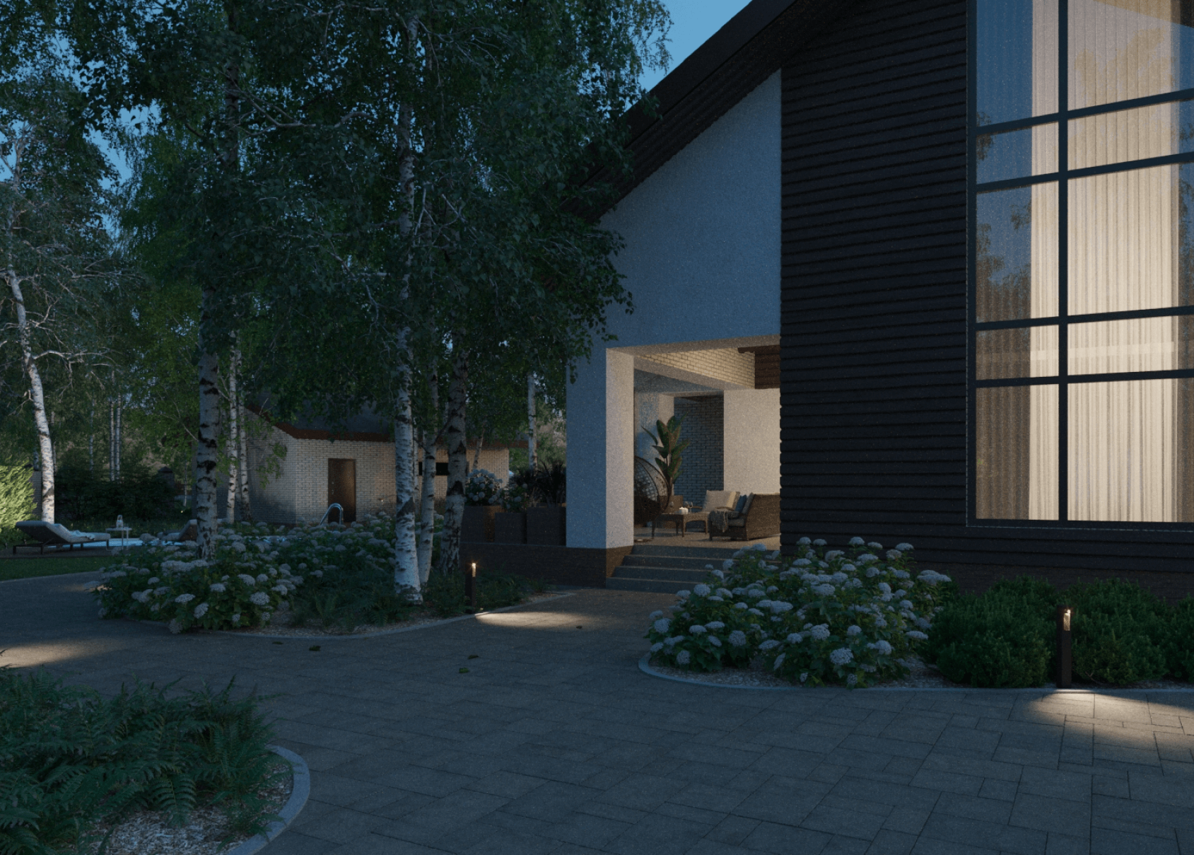 Заказчика устроил результат первого этапа нашей работы, и он принял решение двигаться дальше. Было решено разместить на участке бассейн с зоной отдыха возле. Также хотелось разнообразить утилитарный растительный дизайн, ввести дополнительные элементы, заменить мощение на подходящее к новому дизайну, продумать уличное освещение и автополив.
