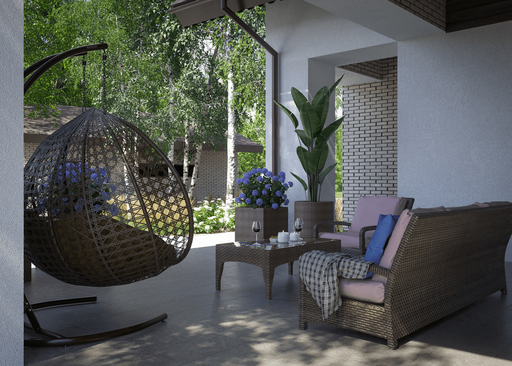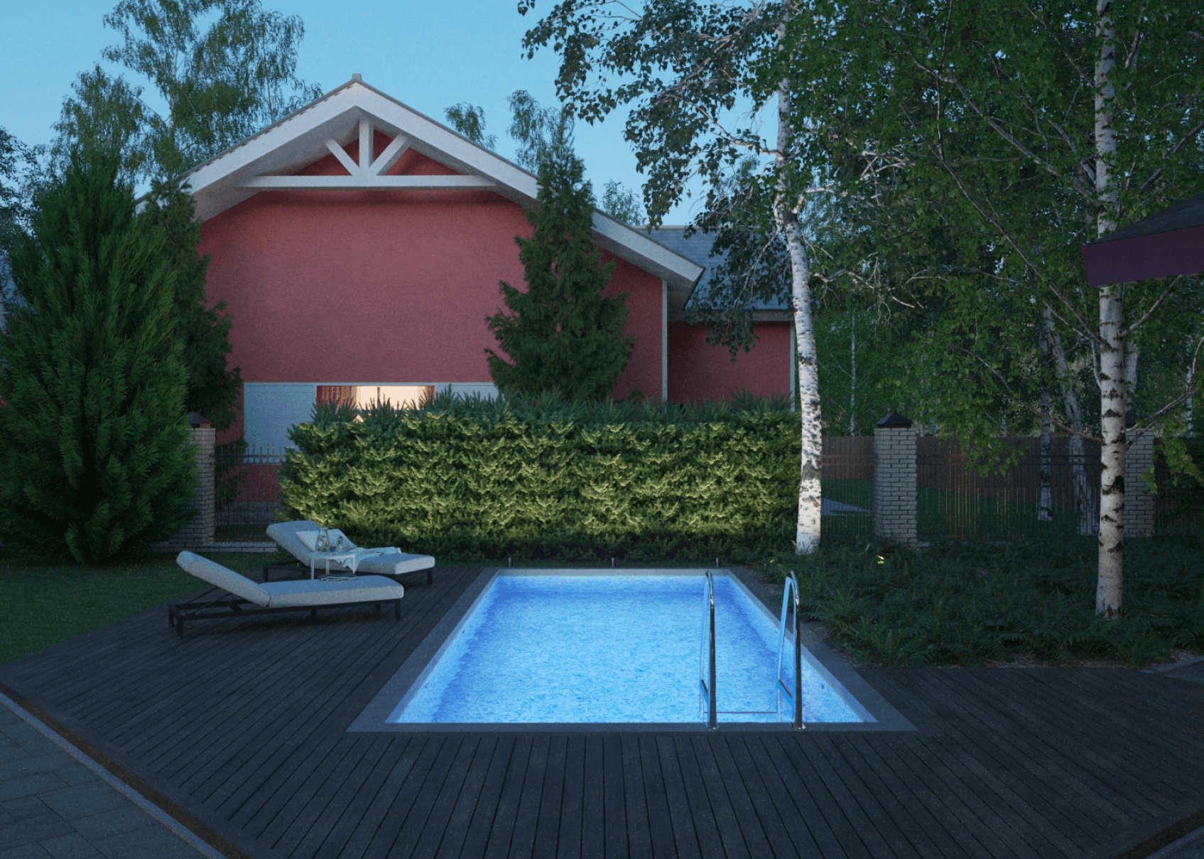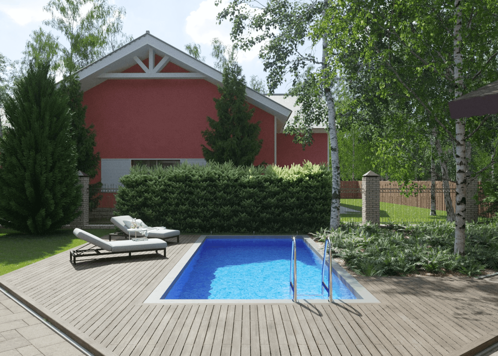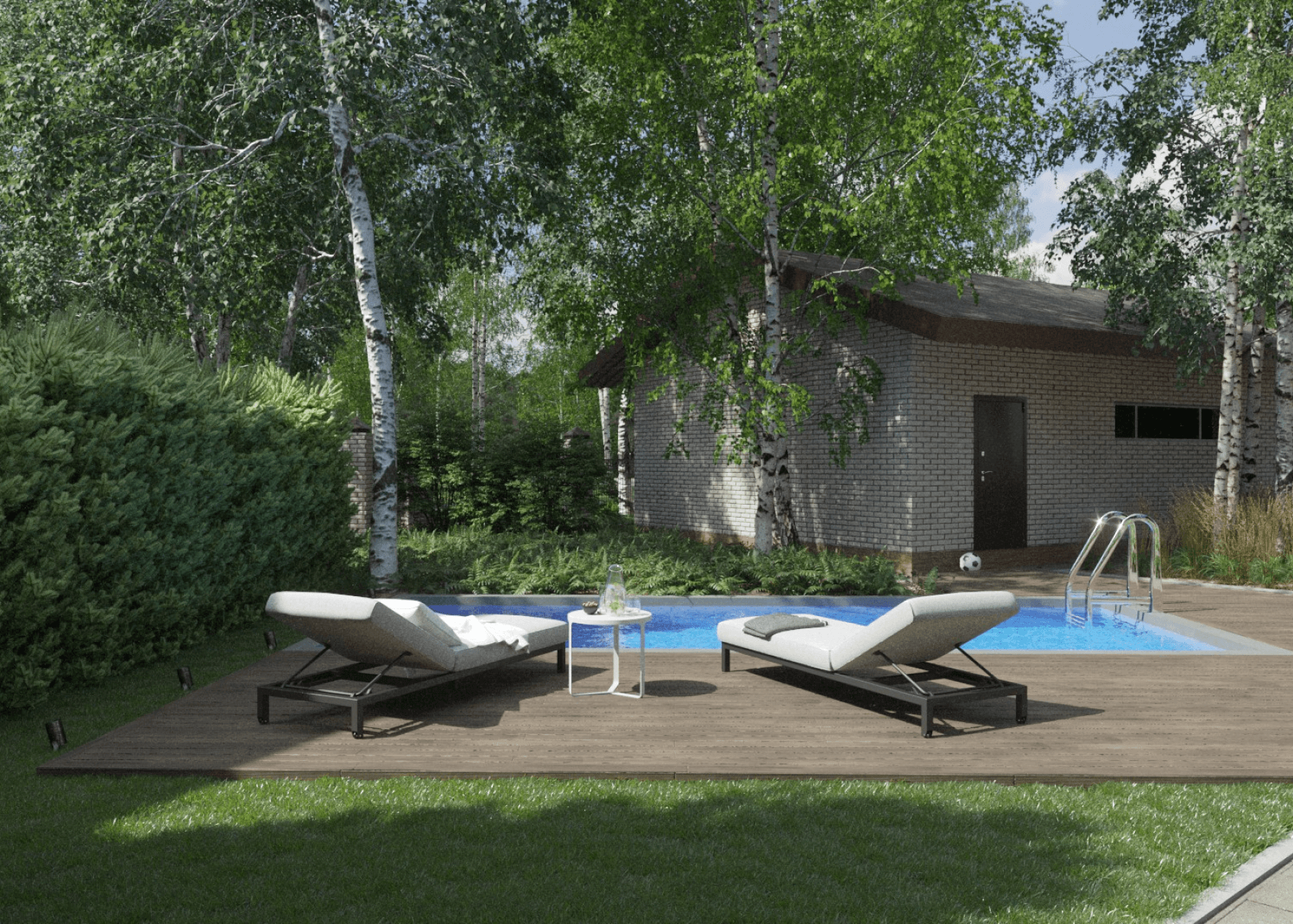 Нами было решено расположить бассейн там, где мы оставили газон, тем самым, уменьшив его площадь. Вокруг бассейна — терраса для отдыха с лежаками. Если не хочется ложиться на лежак — можно лечь прямо на газон, посмотреть вверх на небо и на громады берёз.