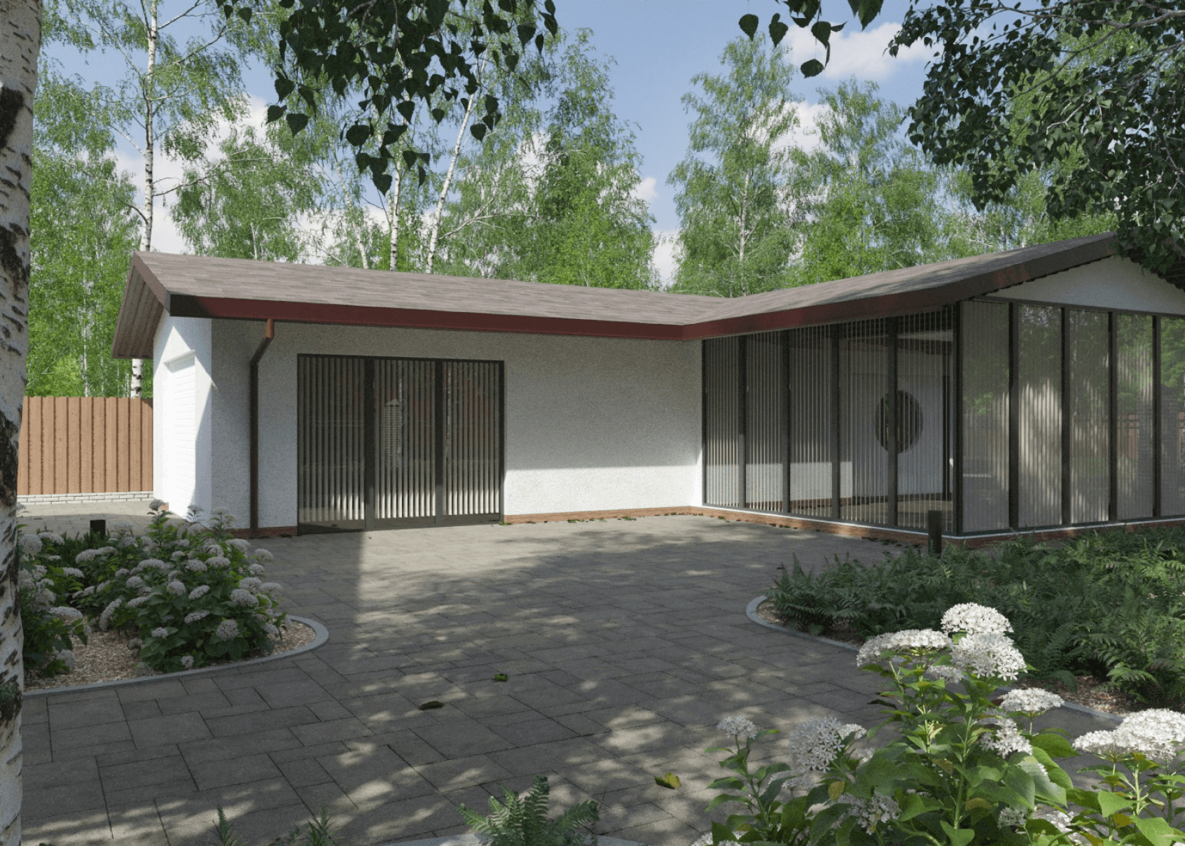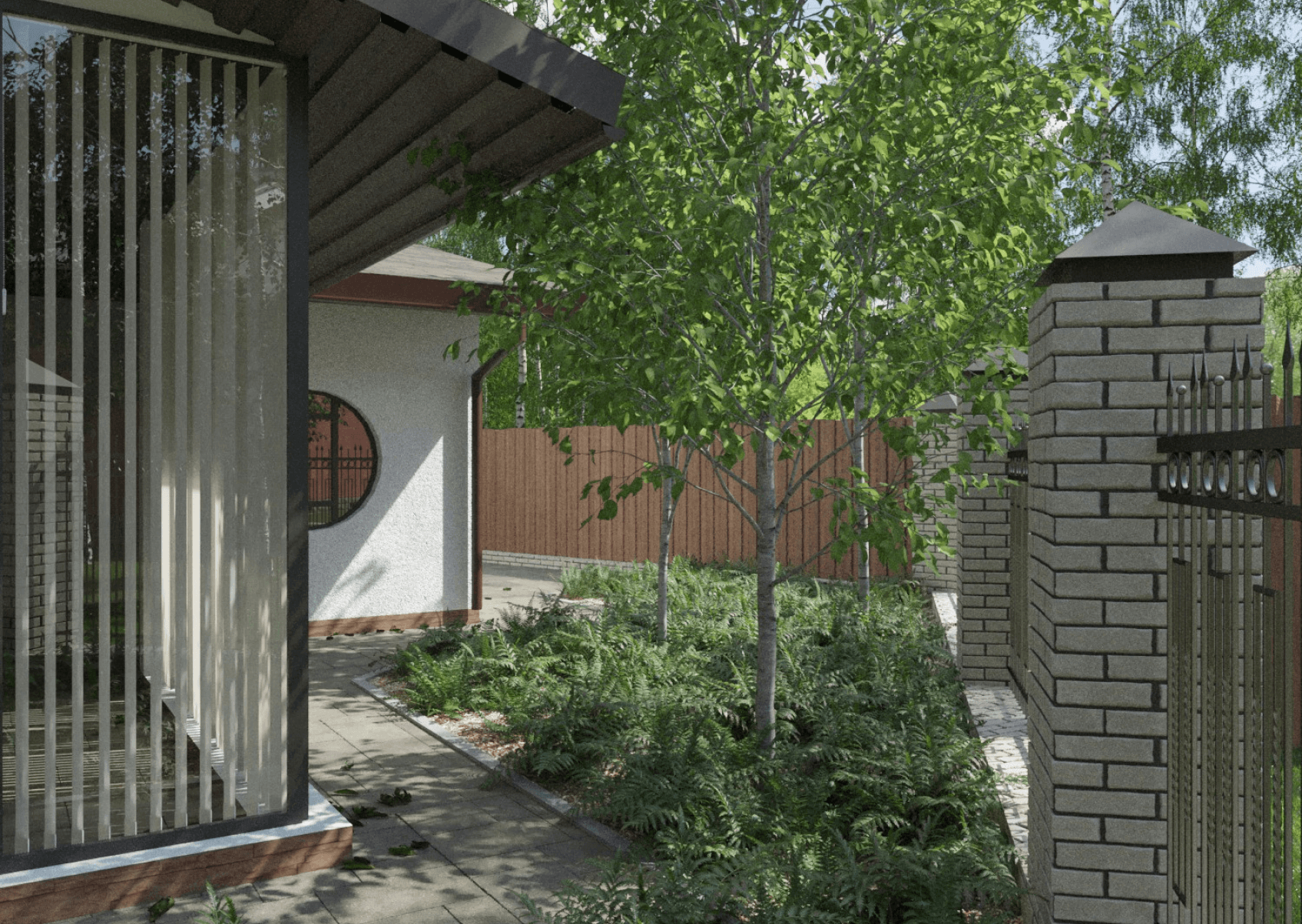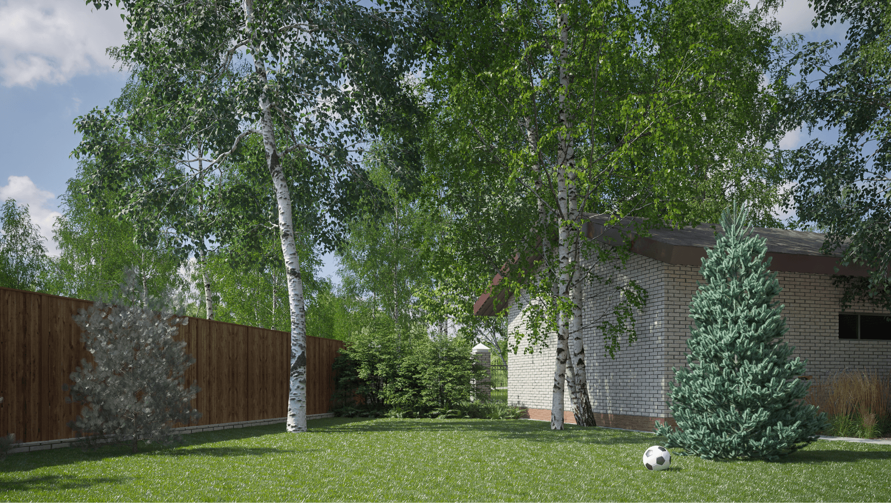 К моменту начала нашей работы над проектом, на участке уже находился двухэтажный жилой дом, гараж и баня с кухней. Были выполнены работы по благоустройству и высажены кое-какие посадки. Эта часть посёлка находится внутри берёзовой рощи, формируя окружающий контекст. Архитектура зданий очень хорошо сочетается с этим контекстом, что задало хорошую основу для дальнейшей работы с участком.