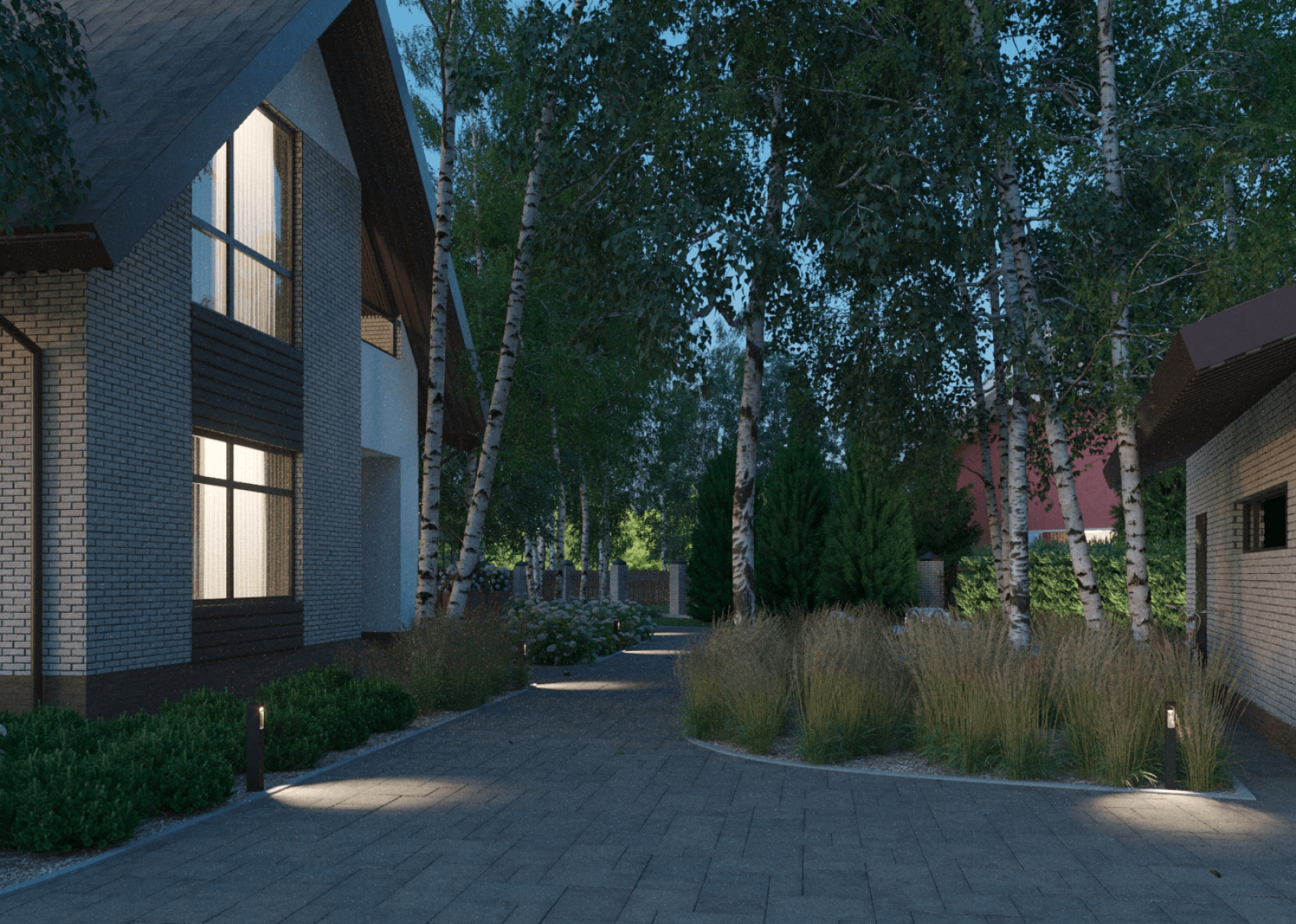 Светильники-столбики выполняют роль как архитектурного освещения, подчеркивая перспективу дорожек участка, так и функциональную роль, подсвечивая основные пути передвижений.